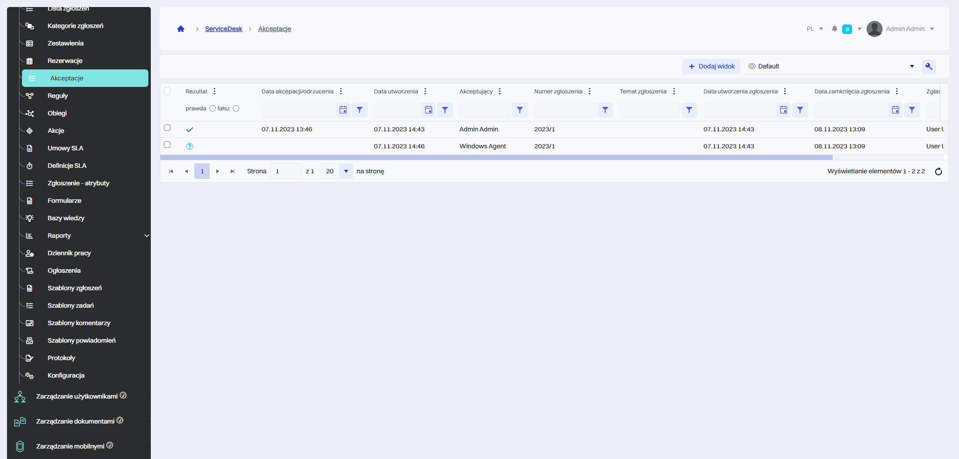 Sekcja "Akceptacje" służy do przeglądania akceptacji w zgłoszeniach. Można tu obserwować status akceptacji, datę akceptacji, identyfikować osoby odpowiedzialne za zatwierdzenie (akceptujące), śledzić numery i tematy zgłoszeń, jak również daty ich utworzenia i ewentualnego zakończenia. Ta funkcja jest niezbędna w procesach, które wymagają weryfikacji lub autoryzacji przez określone osoby lub grupy przed przystąpieniem do dalszych etapów pracy nad zgłoszeniem.