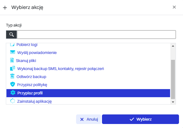 W omawianym przykładzie, przypisana jest akcja “Przypisz profil”, należy kliknąć w dane pole, a następnie kliknąć przycisk “Wybierz”.