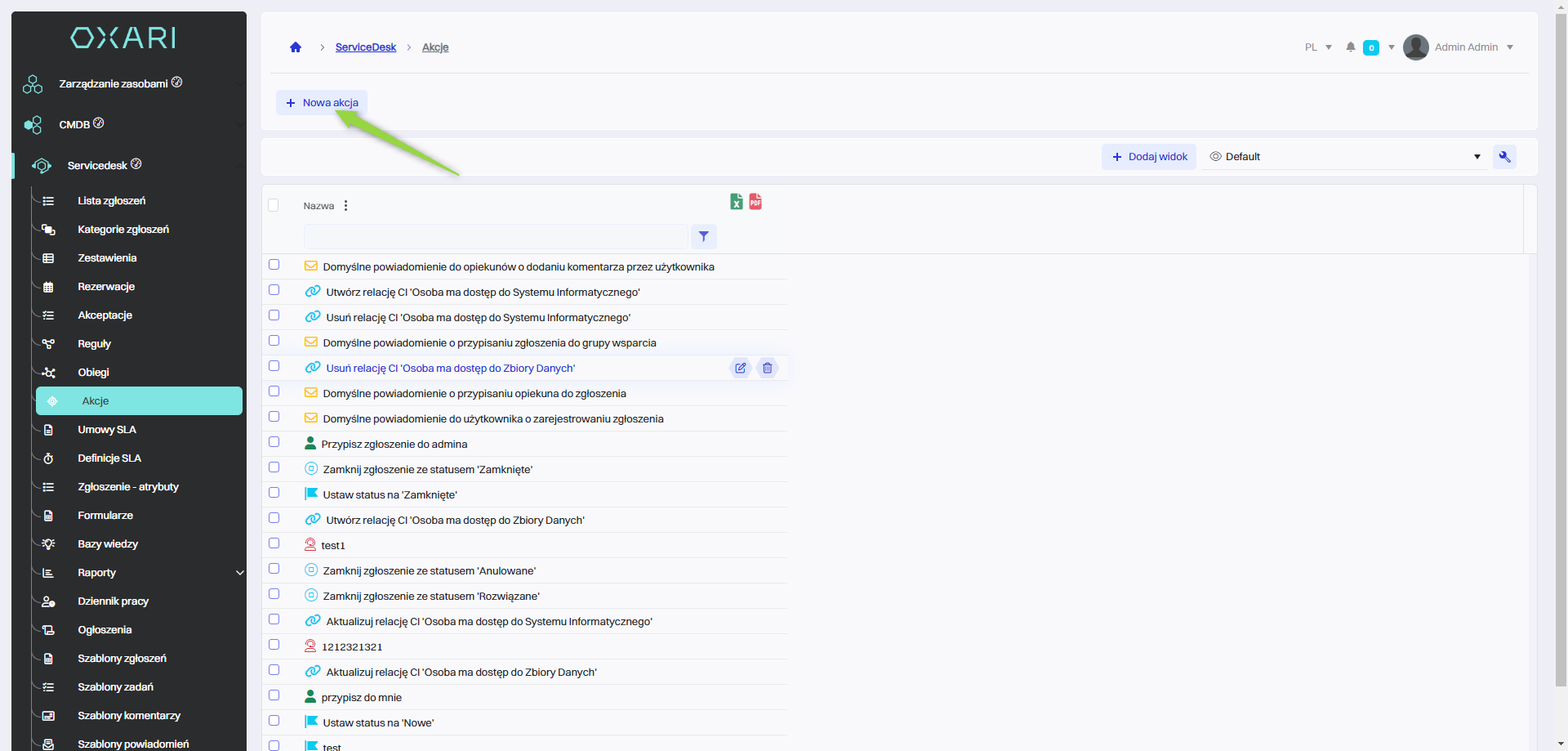 Aby dodać nową akcję, należy przejść do sekcji Servicedesk > Akcje, a następnie kliknąć przycisk “Nowa akcja”.