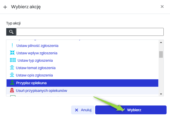 W omawianym przykładzie, przypisana jest akcja “Przypisz opiekuna”, należy kliknąć w dane pole, a następnie kliknąć przycisk “Wybierz”.
