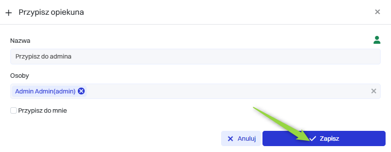 W tym kroku w oknie “Przypisz opiekuna” należy nazwać akcję, wybrać osobę do przypisania i kliknąć przycisk “Zapisz”.