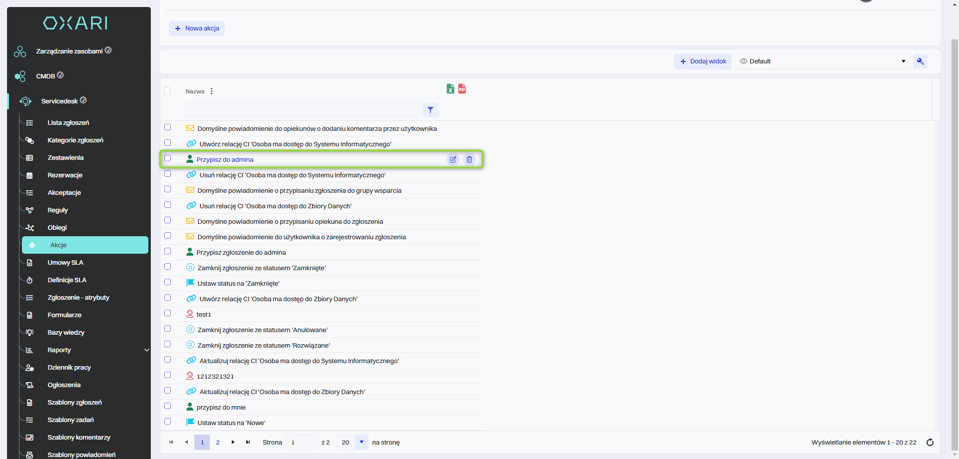 Aby edytować lub usuwać akcje, należy przejść do sekcji Servicedesk > Akcje. Najechać na pożądaną akcję. Wyświetlą się przyciski do edytowania/usuwania.