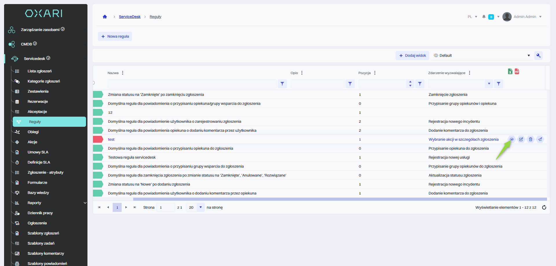Przypisywanie akcji do reguł pozwala na automatyzację zadań. Aby przypisać stworzoną akcję do reguły należy przejść do sekcji Servicedesk > Reguły, następnie kliknąć przycisk “Szczegóły” przy danej regule.
