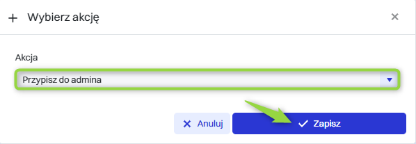 Następnie w oknie “Wybierz akcję” należy w polu “Akcja” wybrać odpowiednią akcję z listy i kliknąć przycisk “Zapisz”.