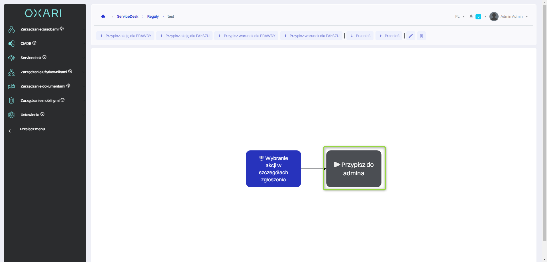 Następnie należy przypisać akcję do reguły, należy kliknąć na dany kafelek i kliknąć przycisk “Przypisz akcję dla PRAWDY”.