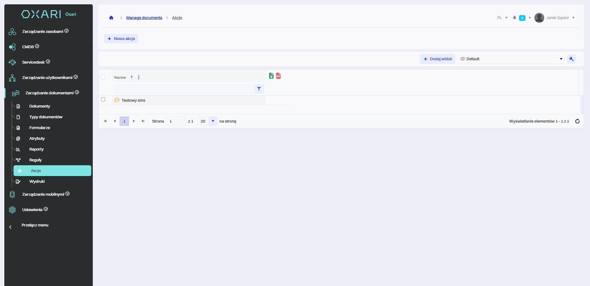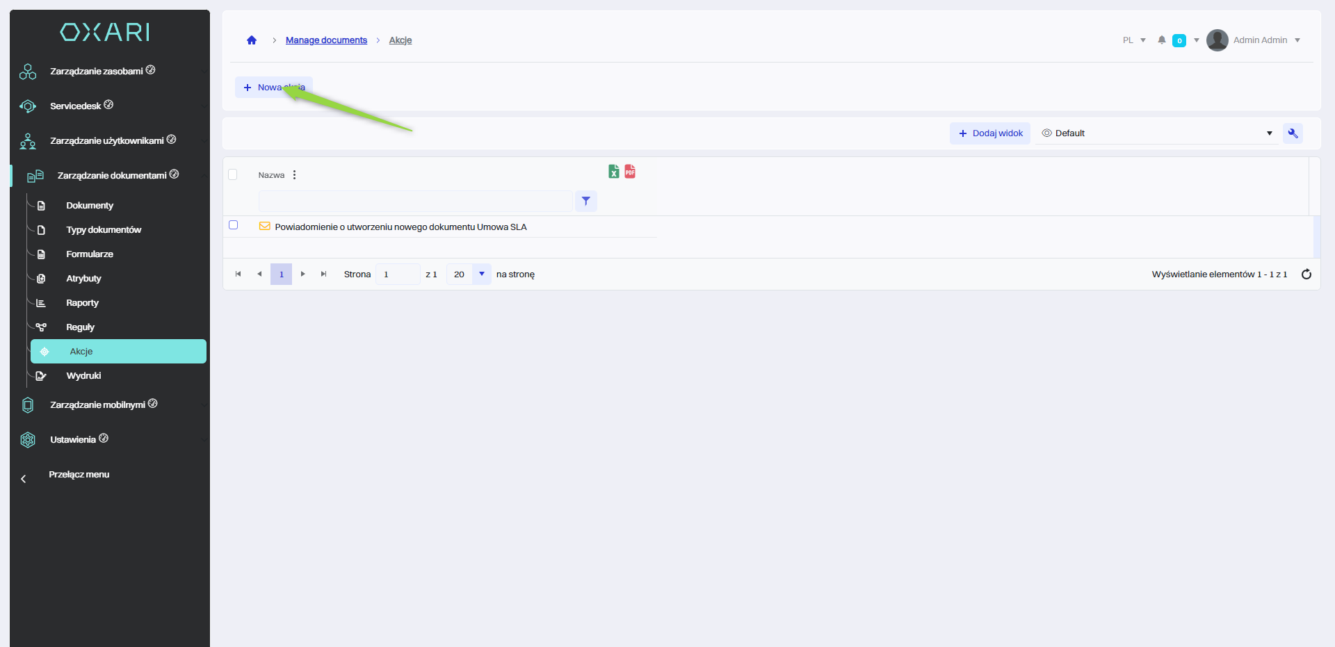 Aby dodać nową akcję, należy przejść do sekcji Zarządzanie dokumentami > Akcje a następnie kliknąć przycisk “Nowa akcja”.