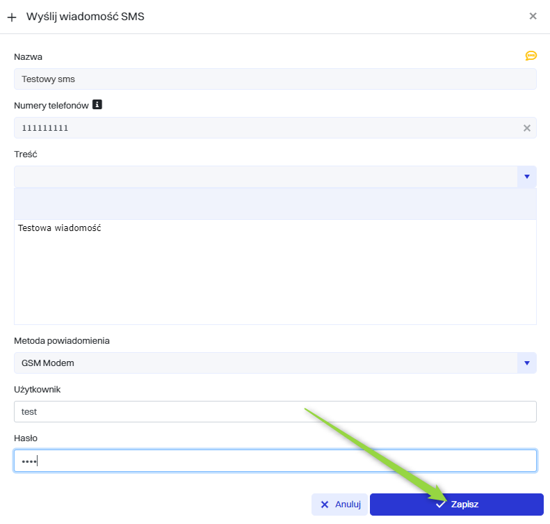 Następnie w oknie “Wyślij wiadomość SMS” należy wypełnić pola i kliknąć przycisk “Zapisz”.