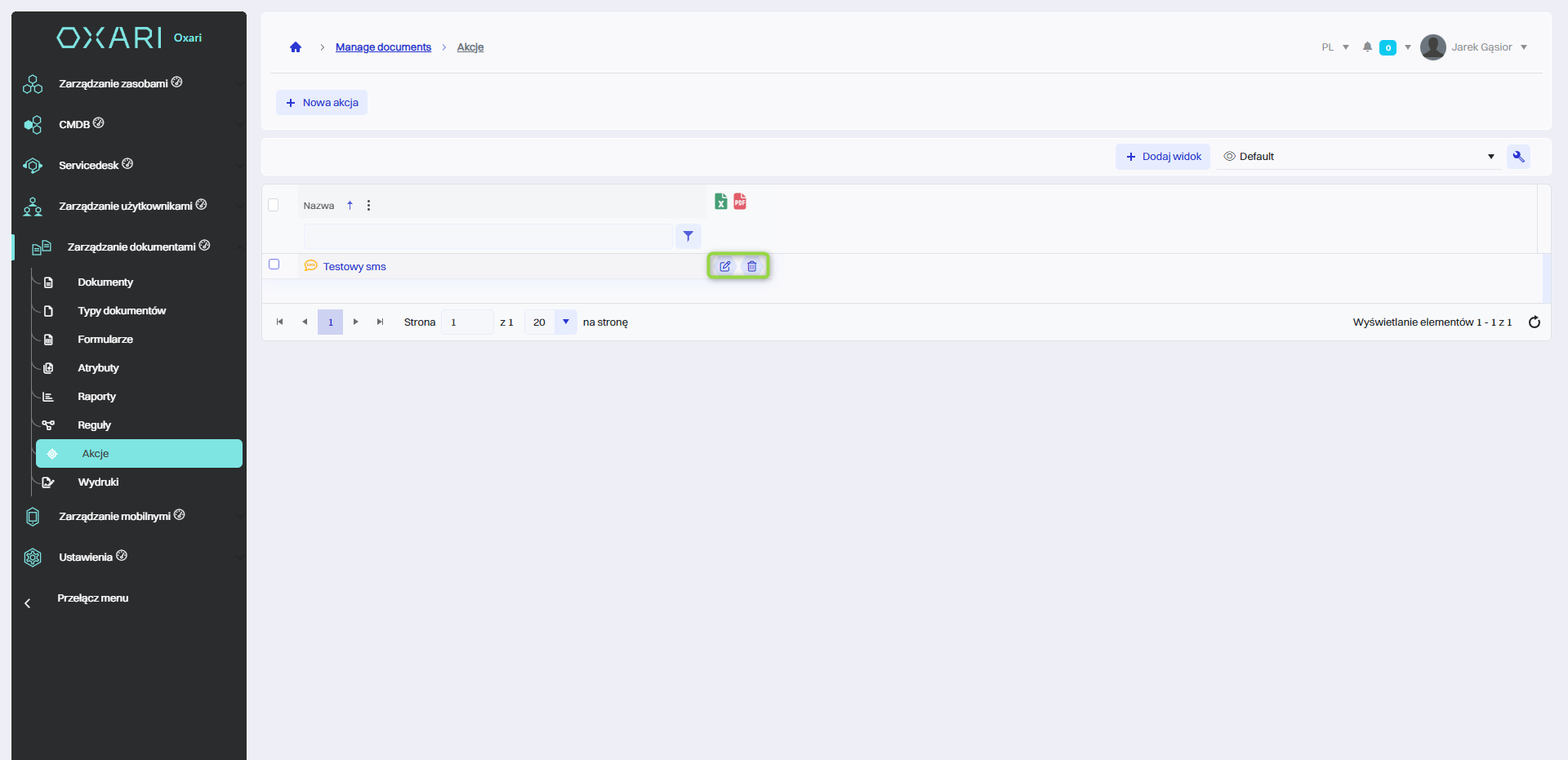 Aby edytować lub usuwać akcje, należy przejść do sekcji Zarządzanie dokumentami > Akcje. Najechać na pożądaną akcję. Wyświetlą się przyciski do edytowania/usuwania.