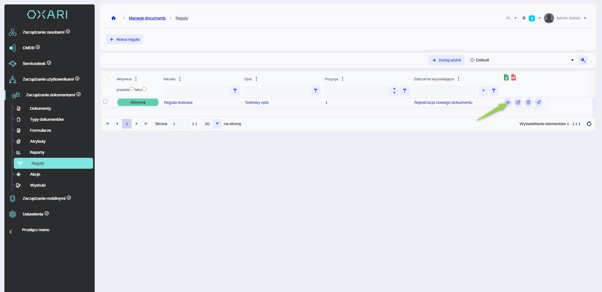 Przypisywanie akcji do reguł pozwala na automatyzację zadań. Aby przypisać stworzoną akcję do reguły należy przejść do sekcji Zarządzanie dokumentami > Reguły, następnie kliknąć przycisk “Szczegóły” przy danej regule.