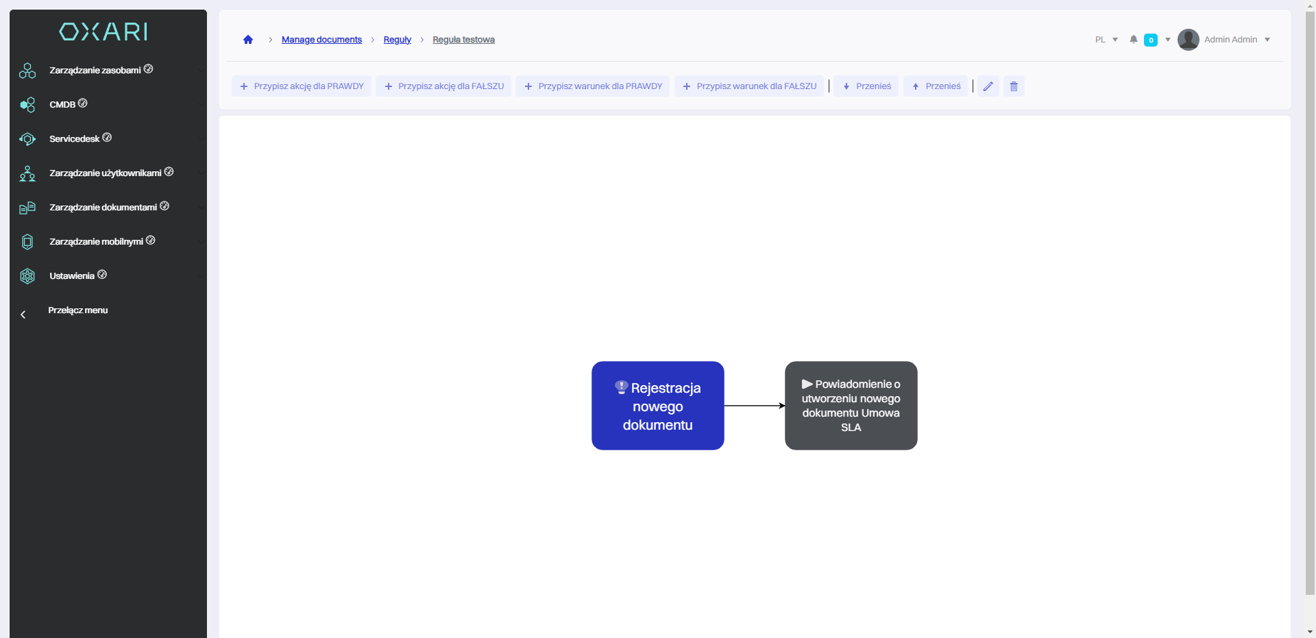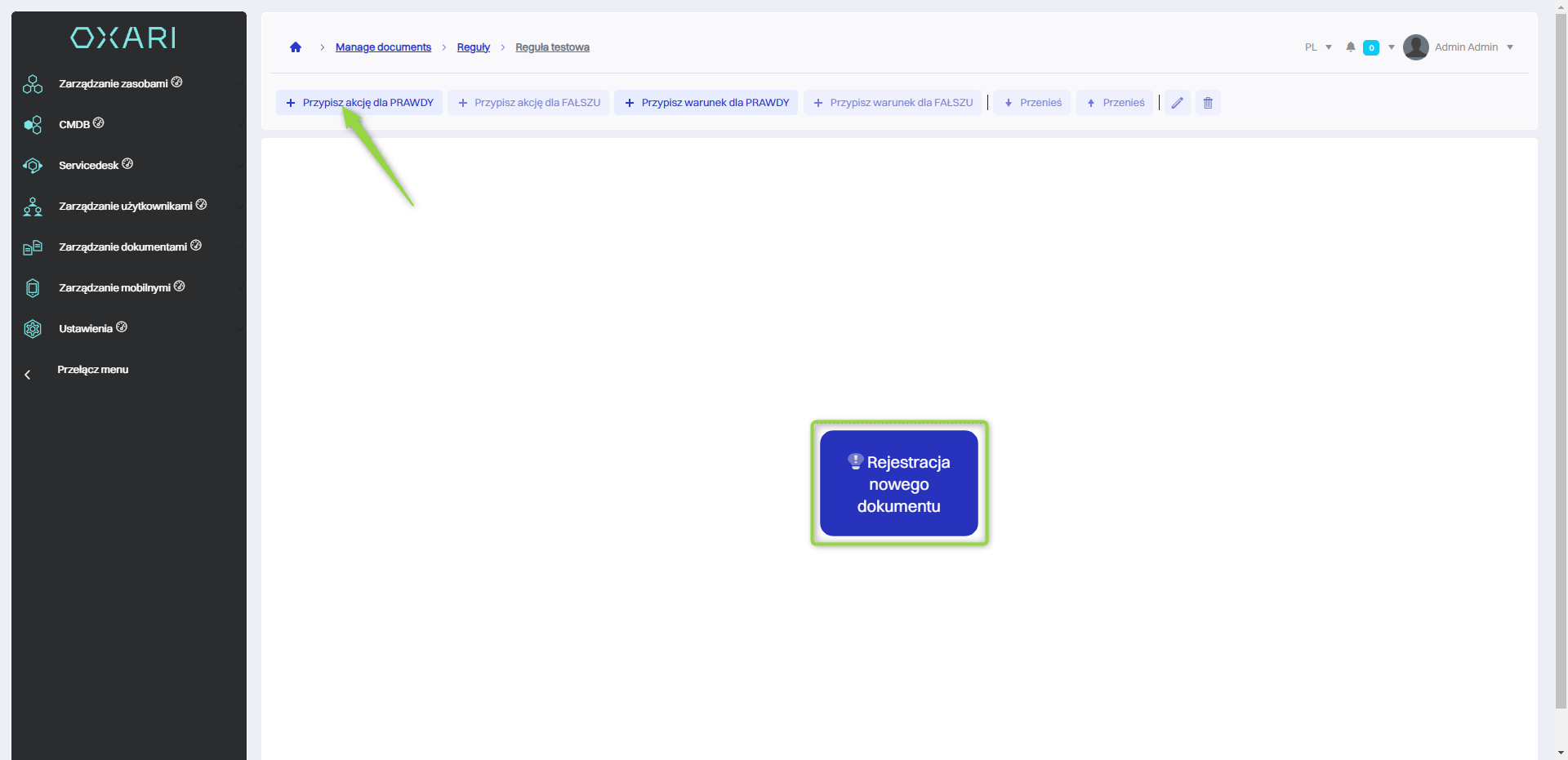 Następnie należy przypisać akcję do danego warunku “Rejestracja nowego dokumenty”, należy kliknąć na dany kafelek i kliknąć przycisk “Przypisz akcję dla PRAWDY”.