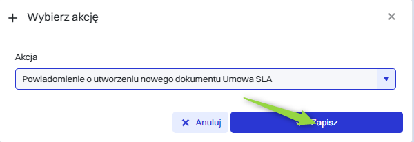 Następnie w oknie “Wybierz akcję” należy w polu “Akcja” wybrać odpowiednią akcję z listy i kliknąć przycisk “Zapisz”.