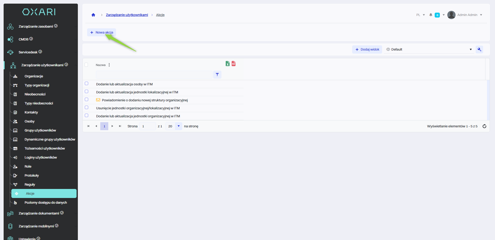Aby dodać nową akcję, należy przejść do sekcji Zarządzanie użytkownikami > Akcje, a następnie kliknąć przycisk “Nowa akcja”.