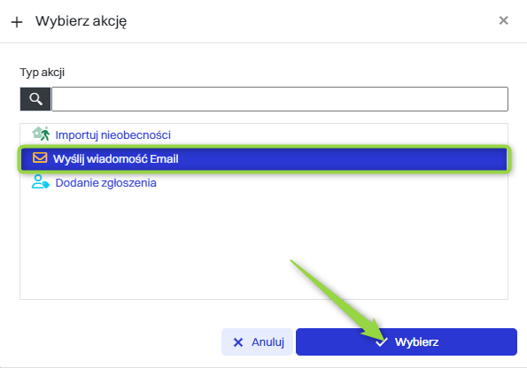 W omawianym przykładzie, przypisana jest akcja “Wyślij wiadomość Email”, należy kliknąć w dane pole, a następnie kliknąć przycisk “Wybierz”.