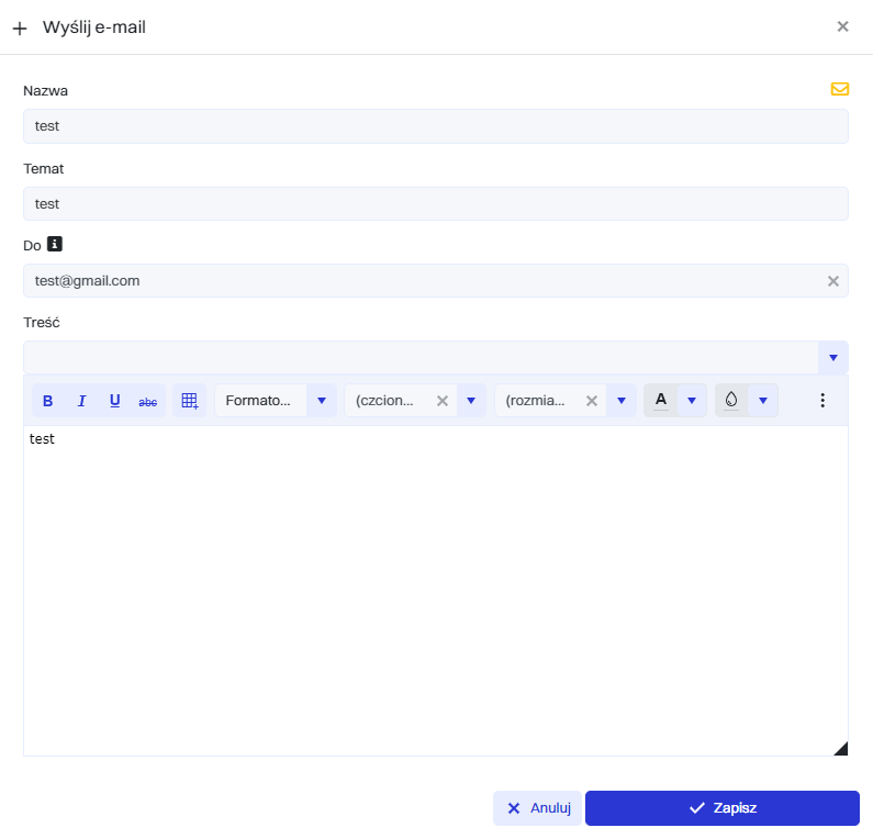 Następnie w oknie “Wyślij e-mail” należy wypełnić pola i kliknąć przycisk “Zapisz”.