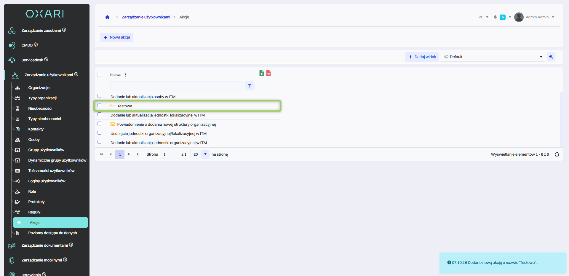 Akcje w systemie zarządzania użytkownikami OXARI to działania, które mogą być wyzwalane automatycznie w ramach zdefiniowanych reguł. Są to predefiniowane zadania, które system wykonuje, gdy są spełnione określone warunki.