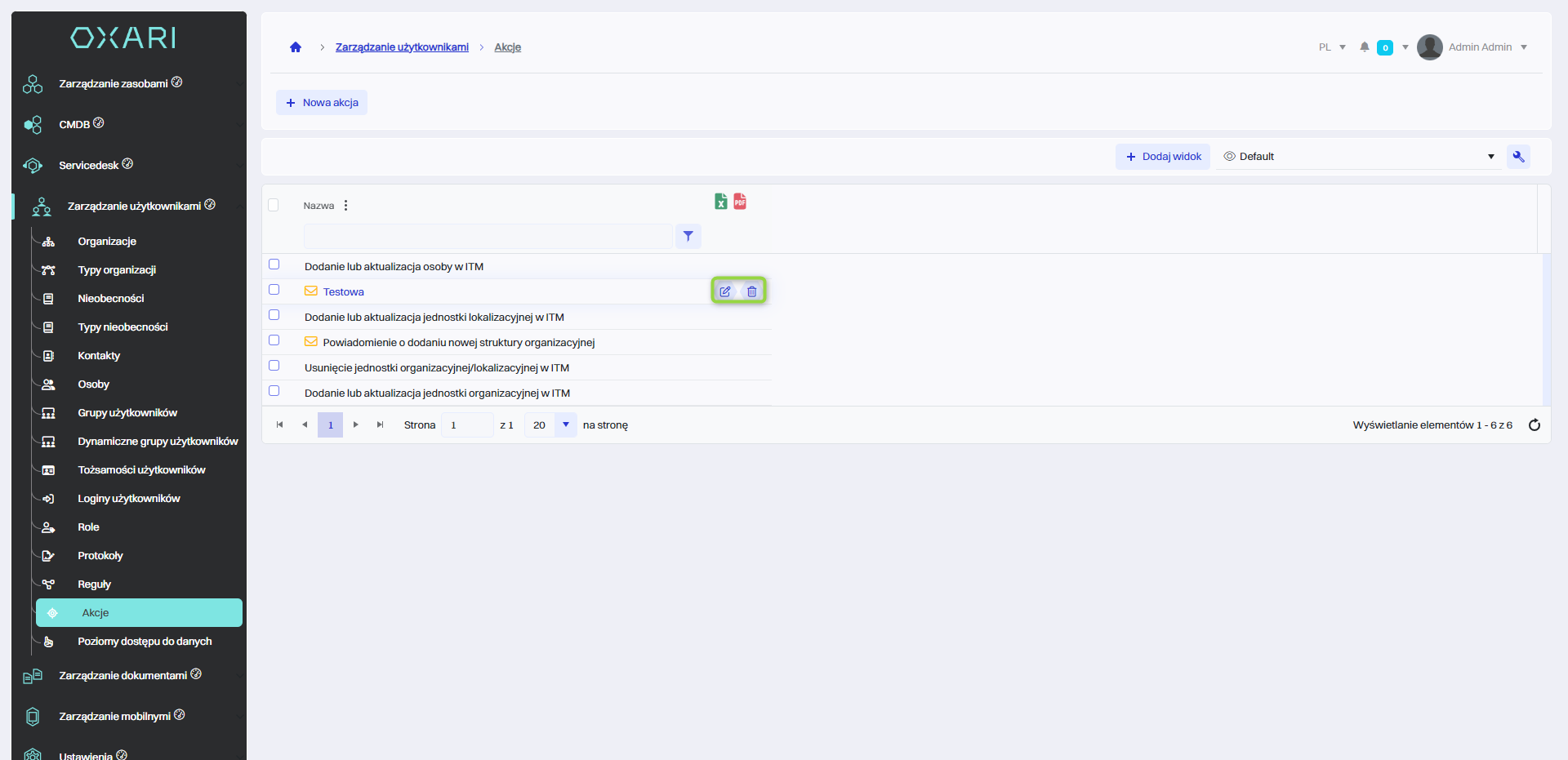 Aby edytować lub usuwać akcje, należy przejść do sekcji Zarządzanie użytkownikami > Akcje. Najechać na pożądaną akcję. Wyświetlą się przyciski do edytowania/usuwania.