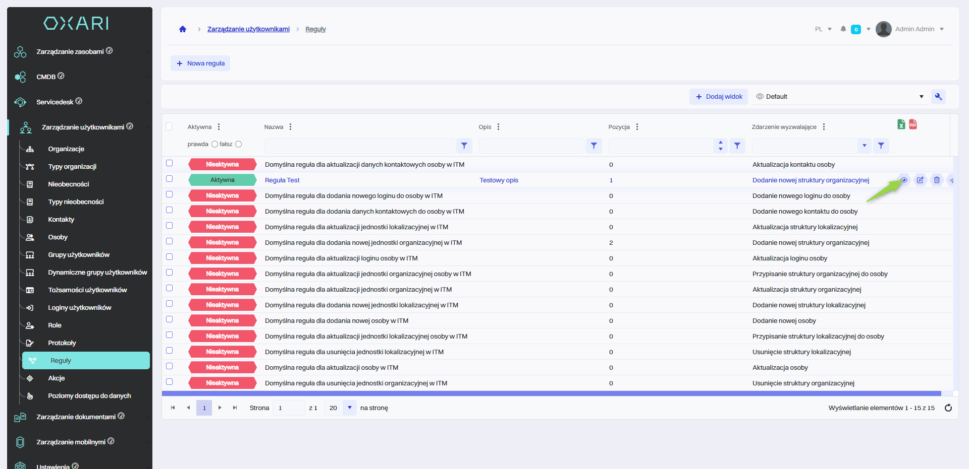 Przypisywanie akcji do reguł pozwala na automatyzację zadań. Aby przypisać stworzoną akcję do reguły należy przejść do sekcji Zarządzanie użytkownikami > Reguły, następnie kliknąć przycisk “Szczegóły” przy danej regule.