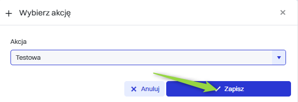 Następnie w oknie “Wybierz akcję” należy w polu “Akcja” wybrać odpowiednią akcję z listy i kliknąć przycisk “Zapisz”.