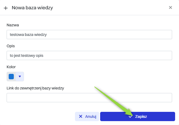 | 3 | Kolor - Można wybrać kolor, który będzie reprezentować bazę wiedzy w interfejsie użytkownika, pomagając w jej wizualnym odróżnieniu. |
