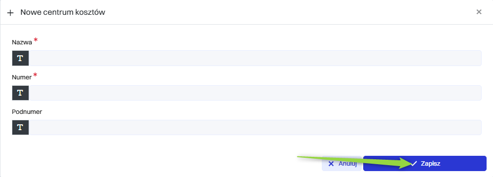 Następnie w oknie “Nowe centrum kosztów” należy wypełnić wymagane pola, a następnie kliknąć przycisk “Zapisz”.