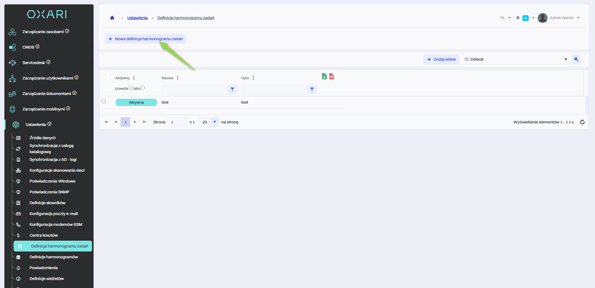 W celu dodania nowej definicji harmonogramu zadań należy przejść do danej sekcji, a następnie kliknąć przycisk “Nowa definicja harmonogramu zadań”.