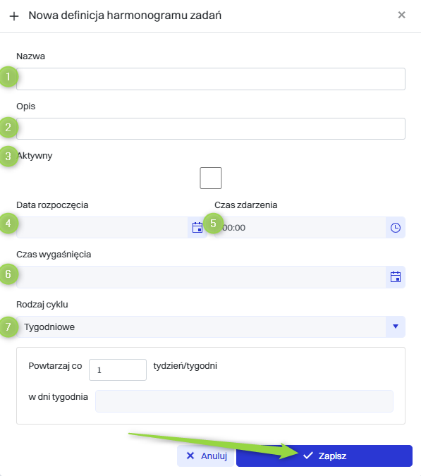 Następnie w oknie “Nowa definicja harmonogramu zadań” należy wypełnić wymagane pola, a następnie kliknąć przycisk “Zapisz”.
