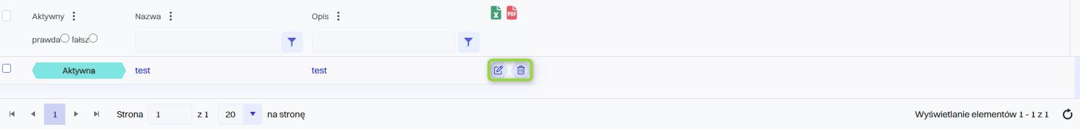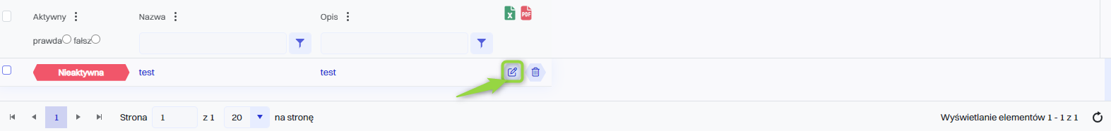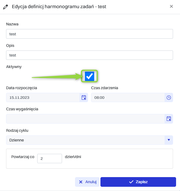 Definicja harmonogramu zadań może być aktywowana lub dezaktywowana, klikając przycisk “Edytuj” a następnie zaznaczenie pola wyboru “Aktywna” w celu aktywacji lub odznaczenia pola wyboru “Aktywna” w celu dezaktywacji.