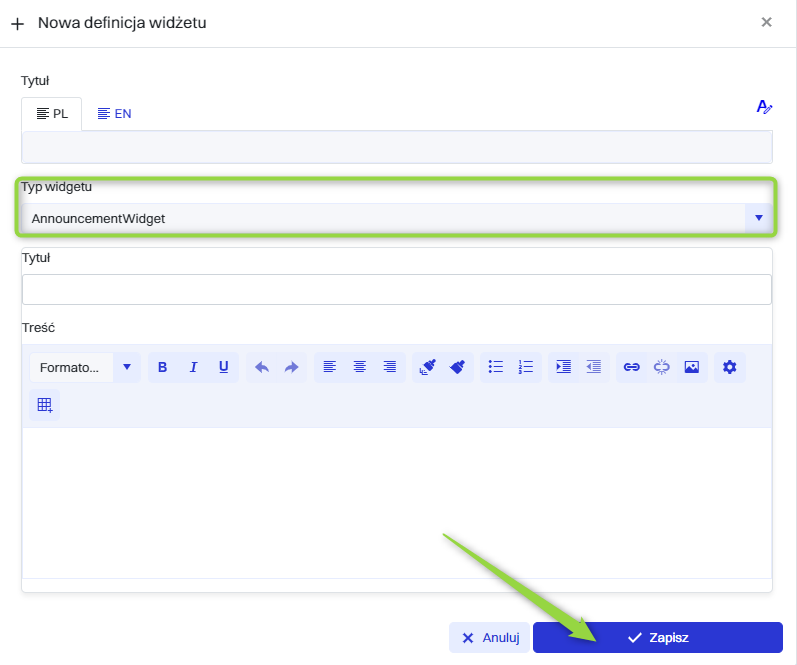 Następnie w polu “Nowa definicja widżetu” należy wypełnić wymagane pola, a następnie kliknąć przycisk “Zapisz”.