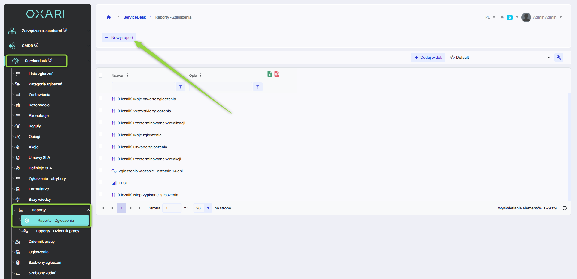 W tym kroku należy przejść do sekcji Servicedesk > Raporty - Zgłoszenia a następnie w celu stworzenia raportu kliknąć przycisk “Nowy raport”.