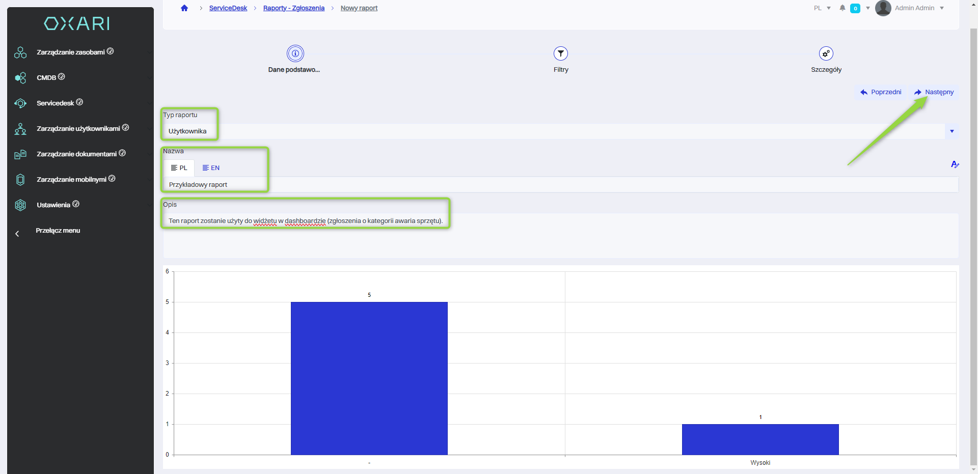 W tym kroku zostają wypełnione podstawowe dane, wybrany Typ raportu, raport zostaje nazwany oraz opisany, następnie klikamy przycisk “Następny”.