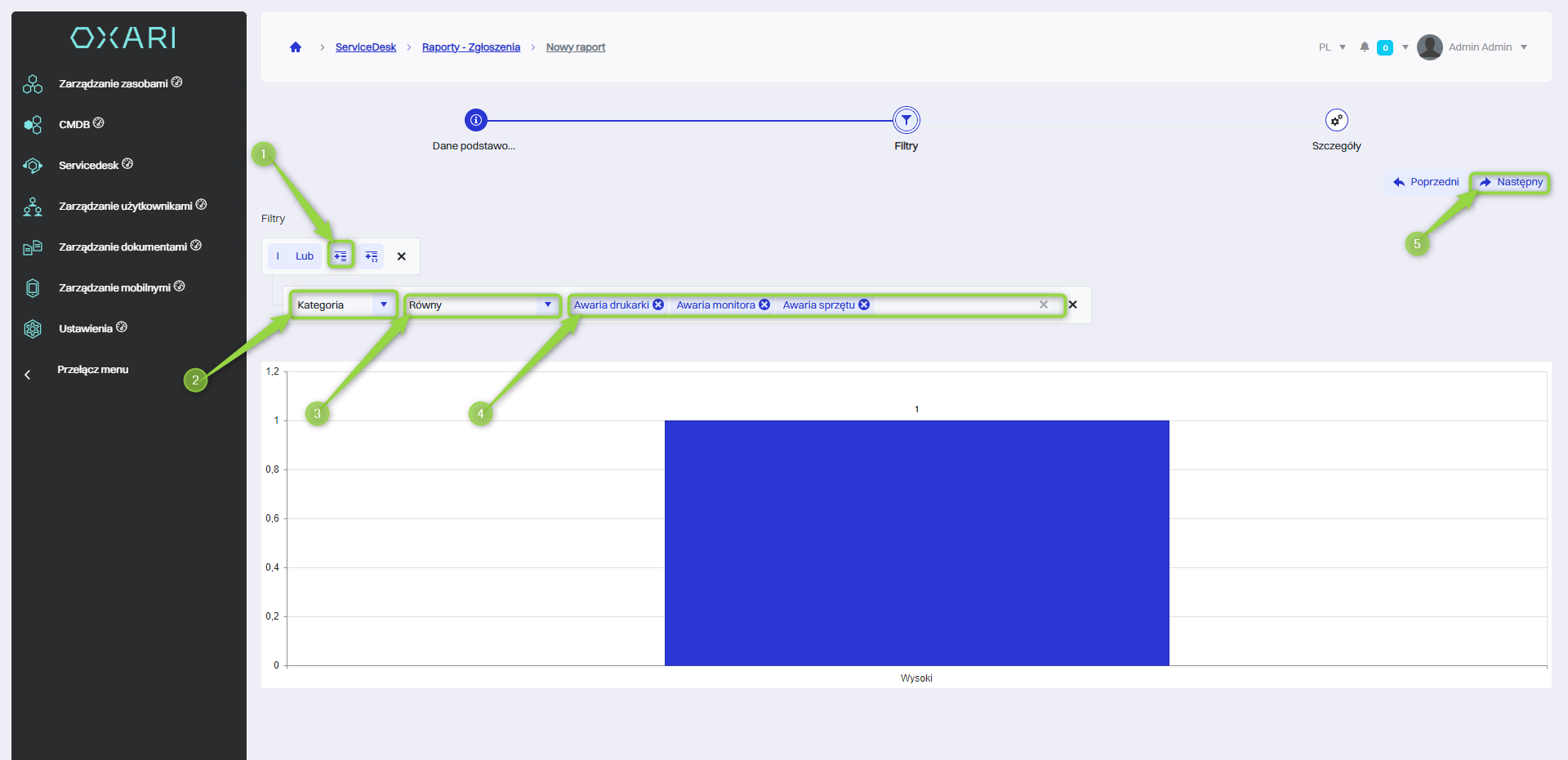 W tym kroku ustalane są filtry raportu. 1. należy kliknąć przycisk “Add Expression” 2. Należy kliknąć w pole w celu ustalenia filtru (w tym przypadku “Kategoria”). 3. Zostaje wybrany operator (w tym przypadku “Równy”) 4. Zostaje wybrana dana kategoria (w tym przypadku “Awaria sprzętu”). 5. Należy kliknąć przycisk “Następny”.
