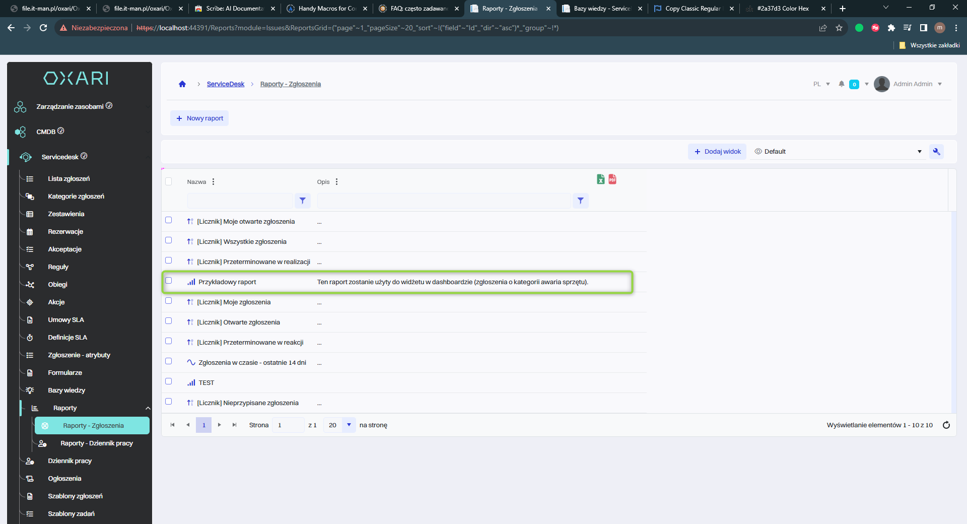 W przykładzie zostanie stworzony widżet z dopasowanego raportu zgłoszeń o kategorii awaria sprzętu, następnie widżet zostanie dodany do dashboardu.