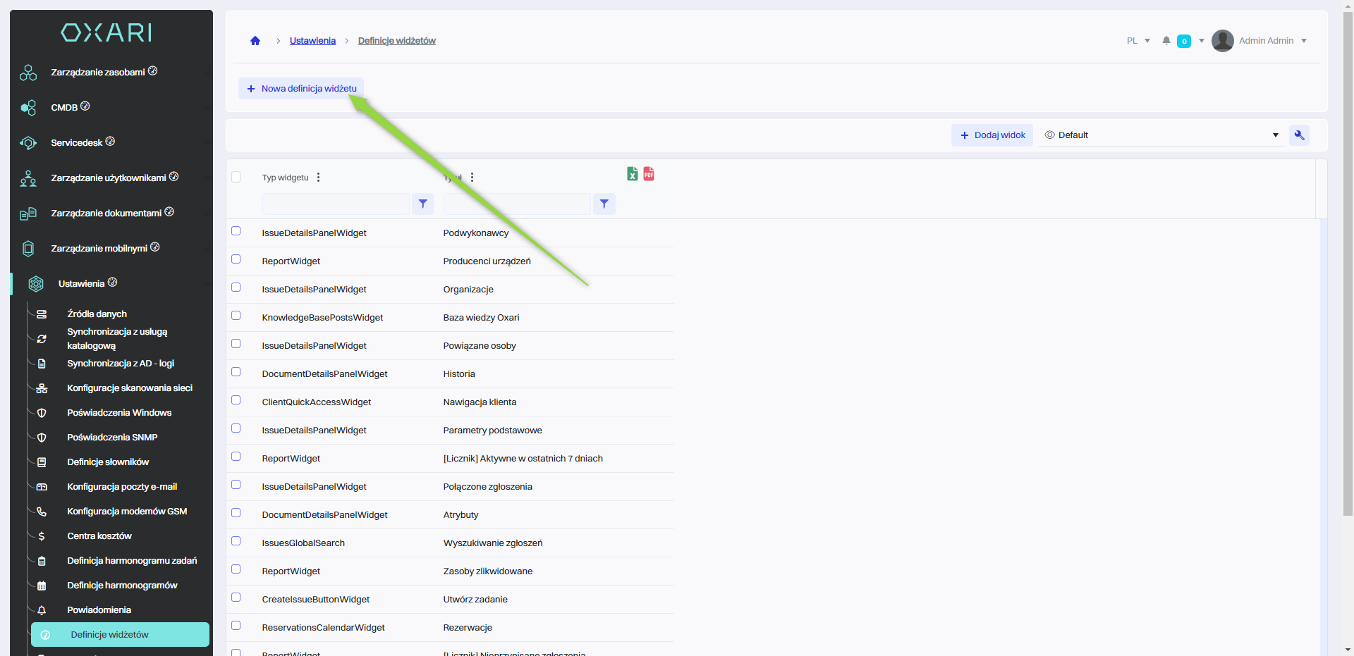 W celu dodania nowej definicji widżetu należy przejść do danej sekcji, a następnie kliknąć przycisk “Nowa definicja widżetu”.