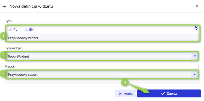 W tym kroku 1. Widżet zostaje nazwany. 2. Typ widżetu zostaje wybrany na “ReportWidget” (widżet ten wyświetla raporty). 3. Zostaje wybrany raport którego będzie używał widżet. 4.Należy kliknąć przycisk “Zapisz”.