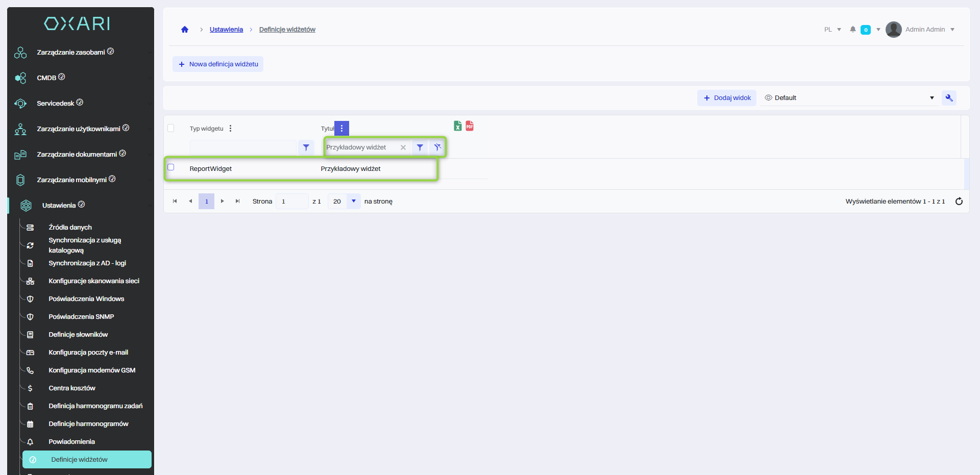 Utworzony widżet jest widoczny w tabeli (wyszukany po tytule).