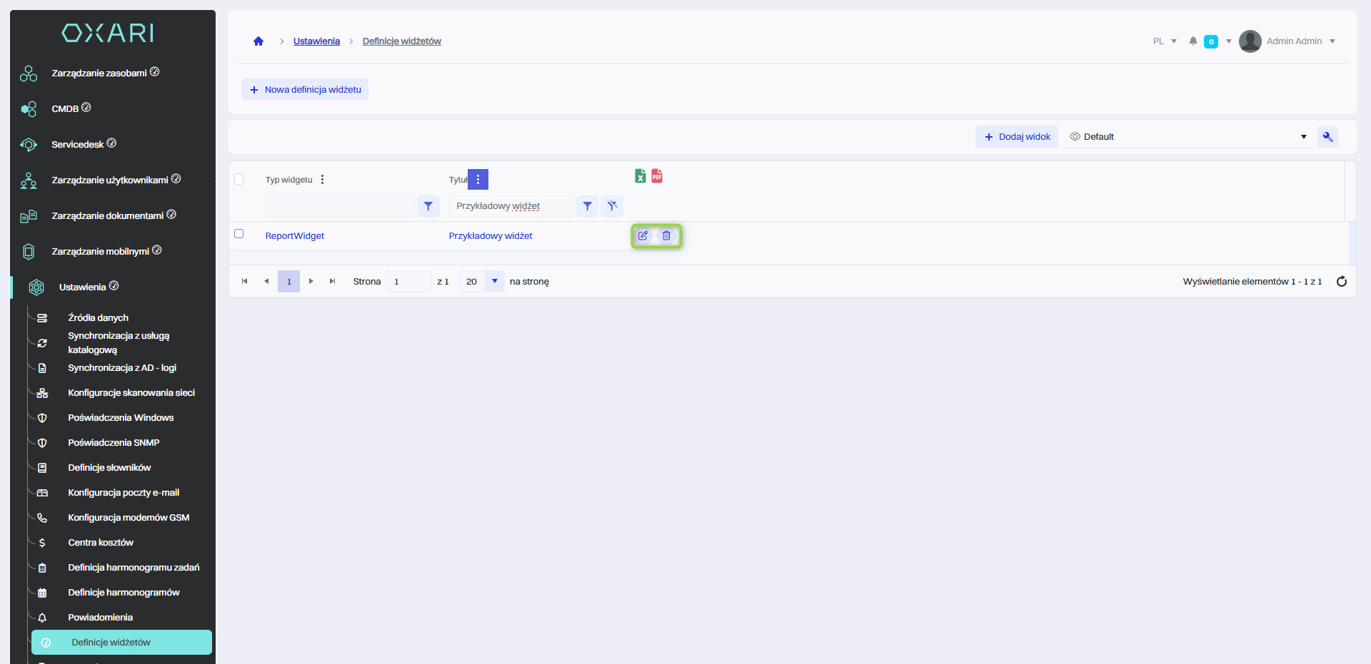 Definicja widżetu może być edytowana lub usunięta przy użyciu następujących przycisków.