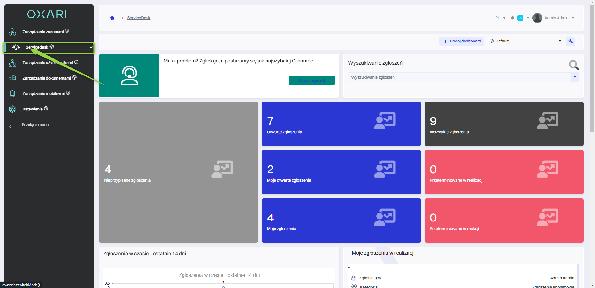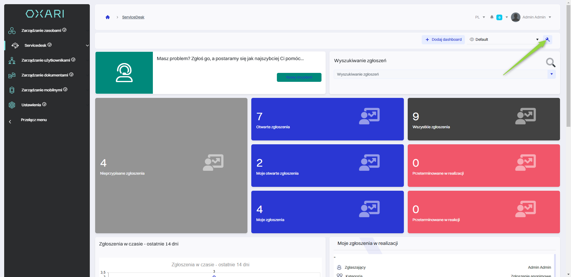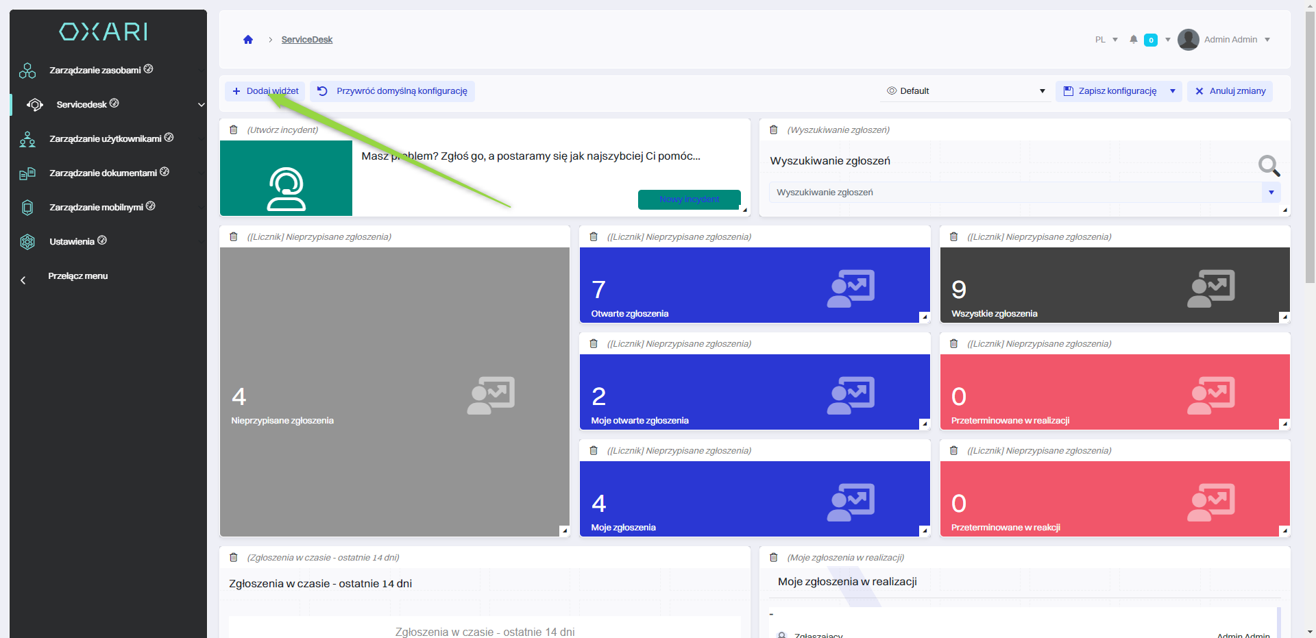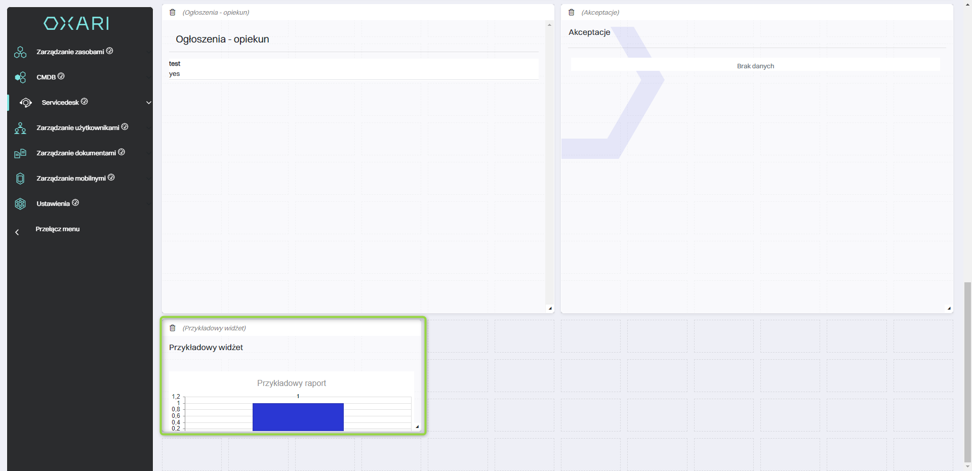 Widżety w systemie OXARI to interaktywne elementy lub komponenty interfejsu użytkownika, które zapewniają szybki dostęp do różnych funkcji systemowych, informacji lub danych. Widżety można dodać do dashboardu użytkownika w OXARI, a także dodać do widoku w Servicedesk. Są dostępne widżety również w widoku pojedynczego zgłoszenia w sekcji Servicedesk > Lista zgłoszeń