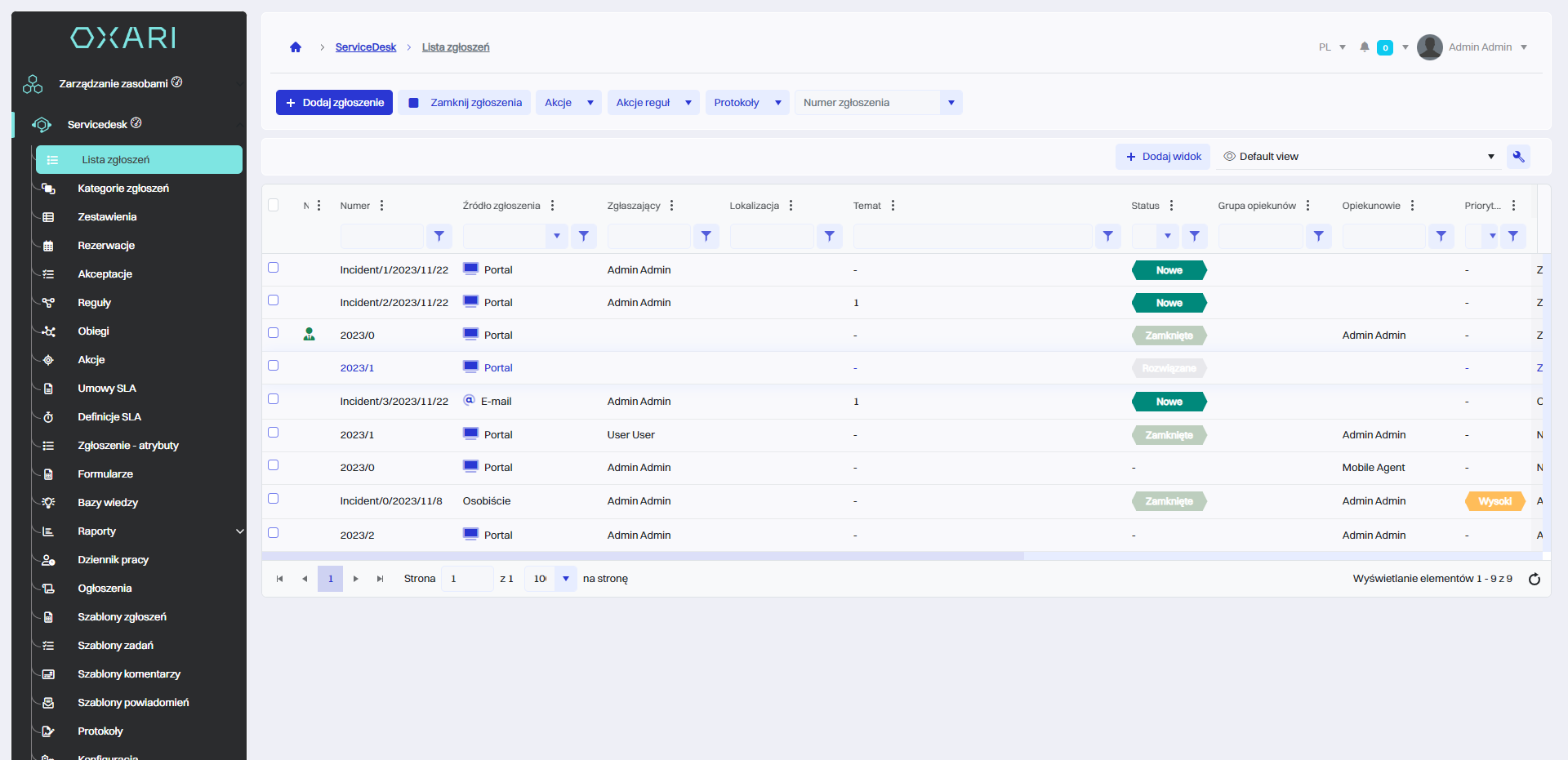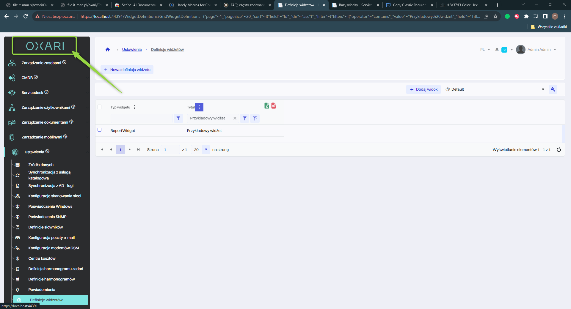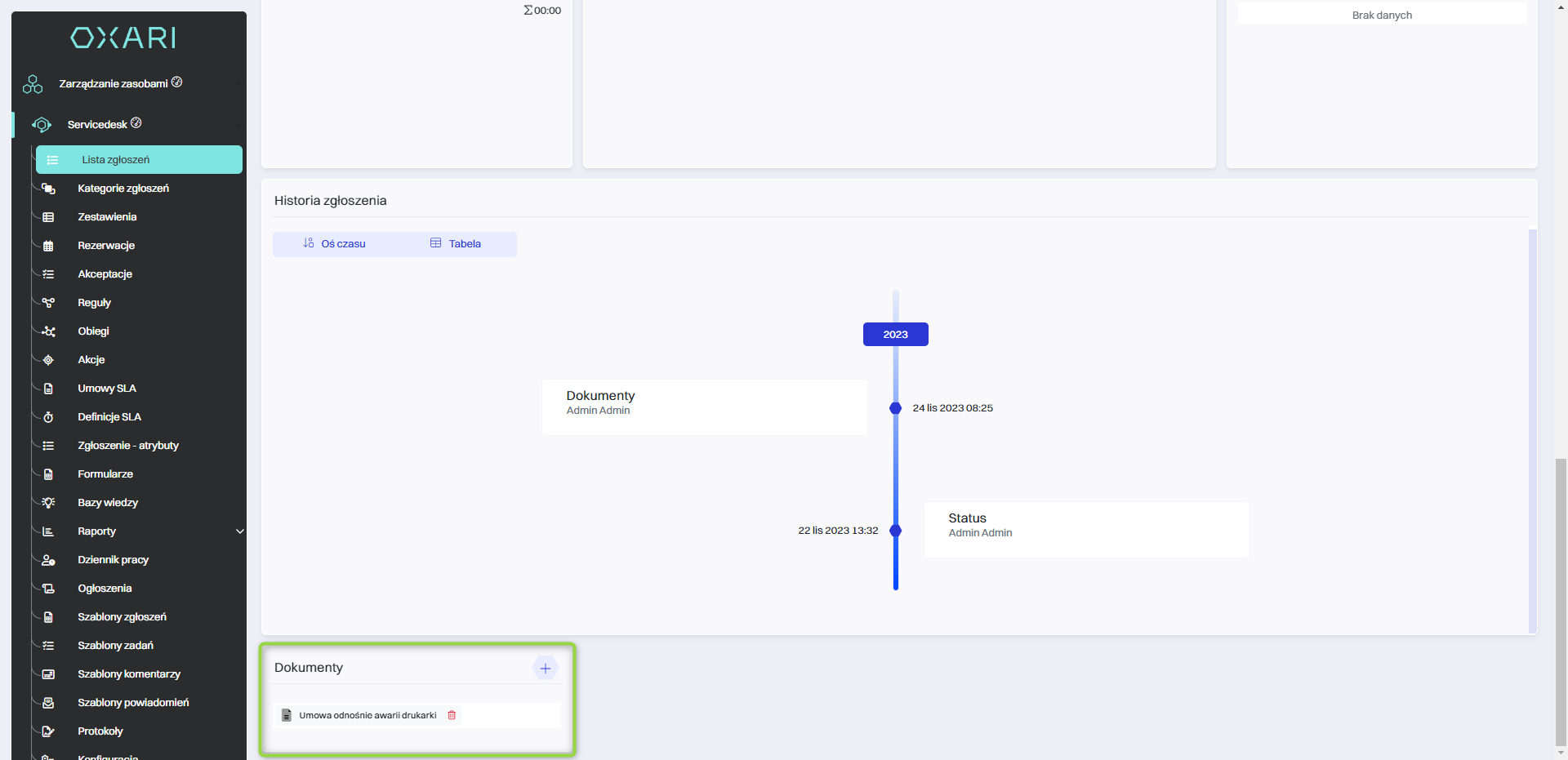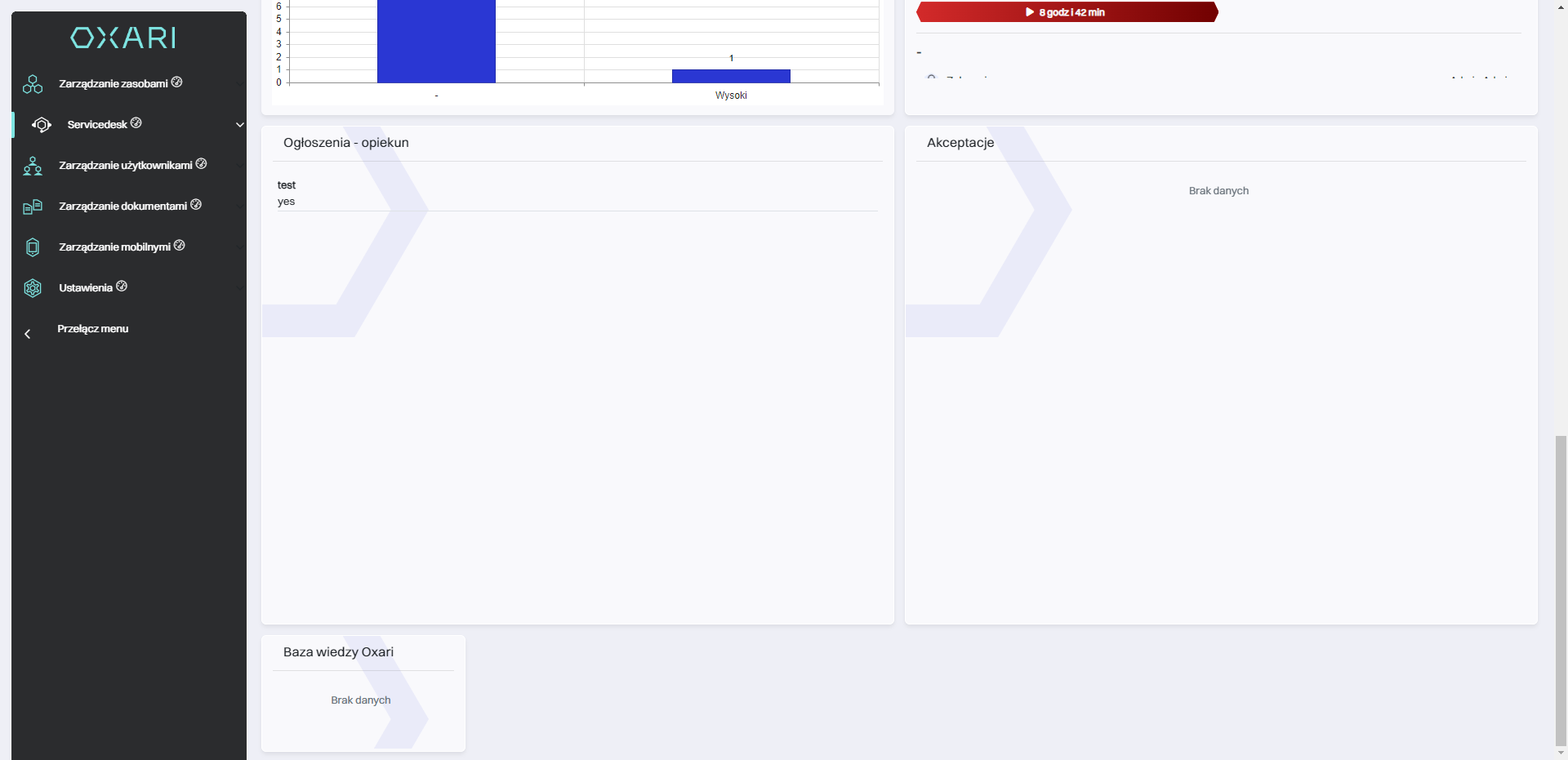 Widżety w systemie OXARI to interaktywne elementy lub komponenty interfejsu użytkownika, które zapewniają szybki dostęp do różnych funkcji systemowych, informacji lub danych. Widżety można dodać do dashboardu użytkownika w OXARI, a także dodać do widoku w Servicedesk. Są dostępne widżety również w widoku pojedynczego zgłoszenia w sekcji Servicedesk > Lista zgłoszeń