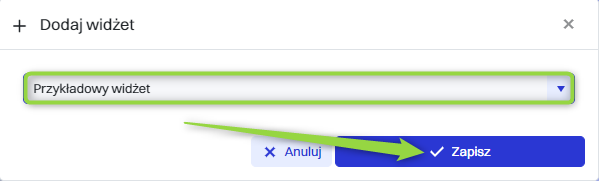 Następnie w oknie “Dodaj widżet” należy wybrać pożądany wiżdet z listy i kliknąć przycisk “Zapisz”.