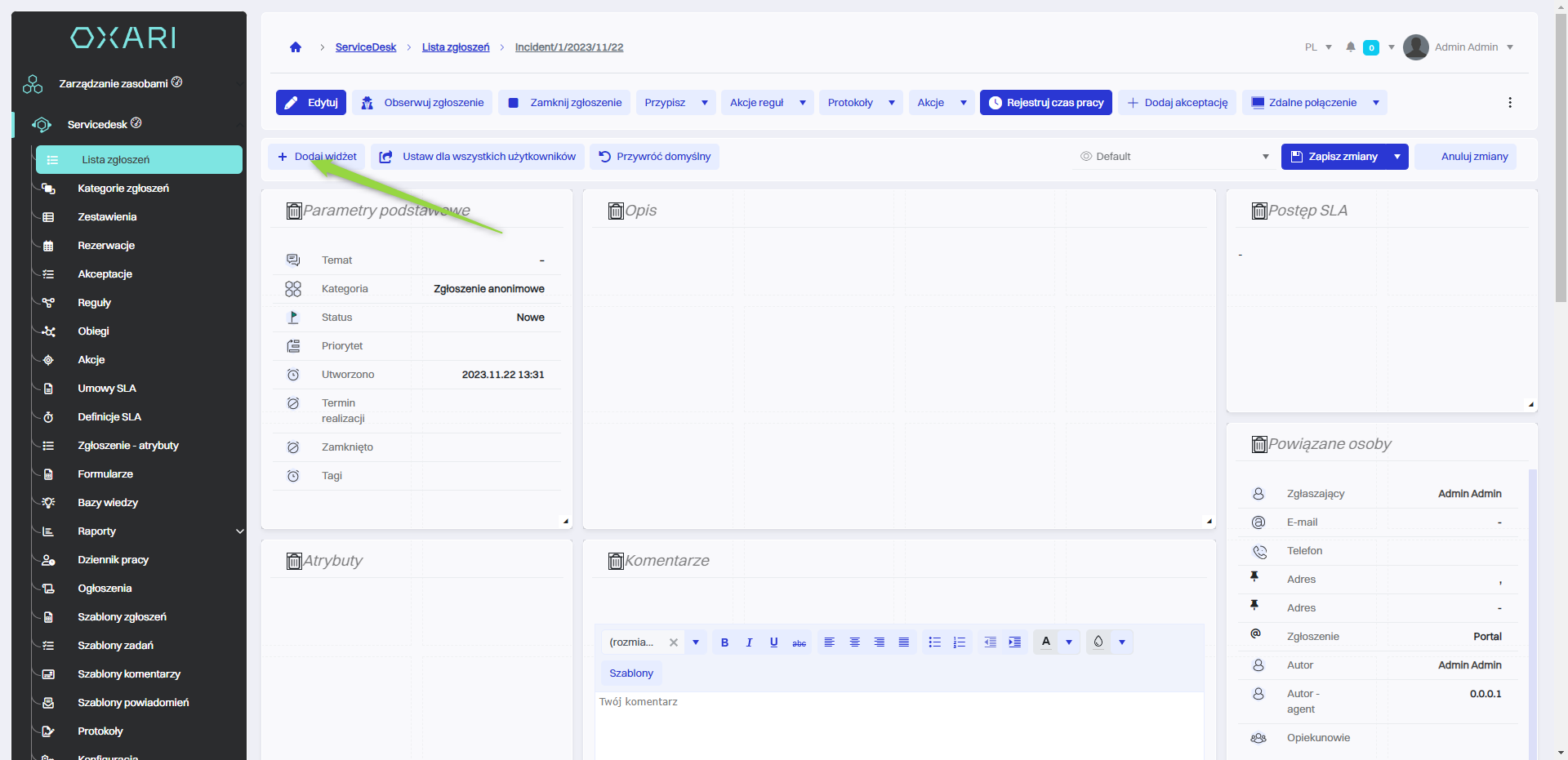 Dodawanie widżetu na widok pojedynczego zgłoszenia
