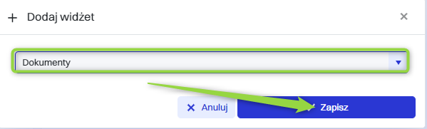 Następnie w oknie “Dodaj widżet” wybrać z listy “Dokumenty” i kliknąć przycisk “Zapisz”.