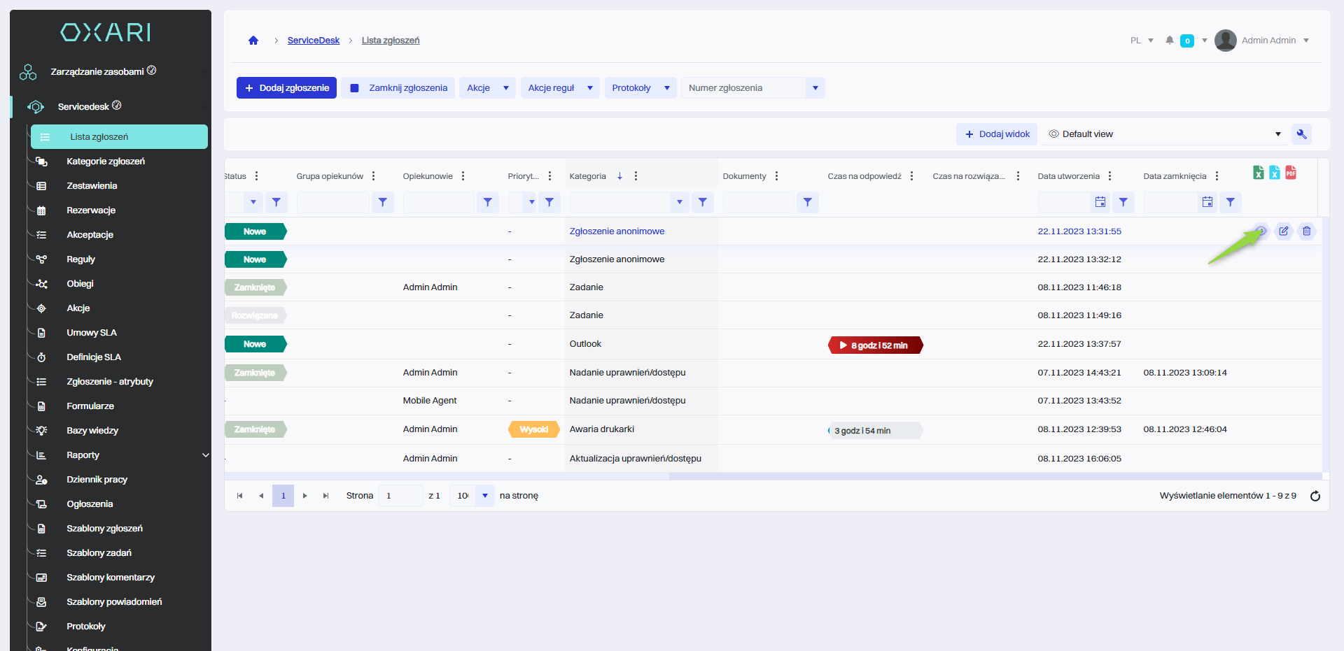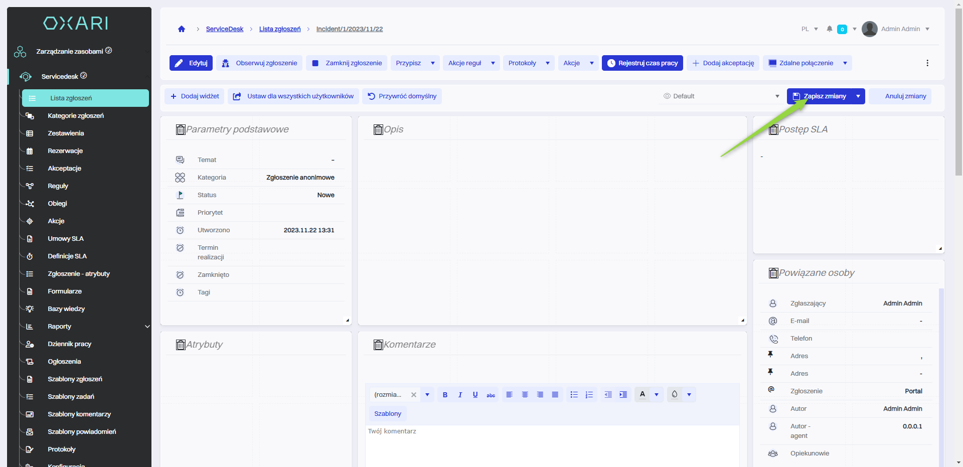 Aby dodać widżet do pojedynczego zgłoszenia należy przejść do sekcji Servicedesk > Lista zgłoszeń.