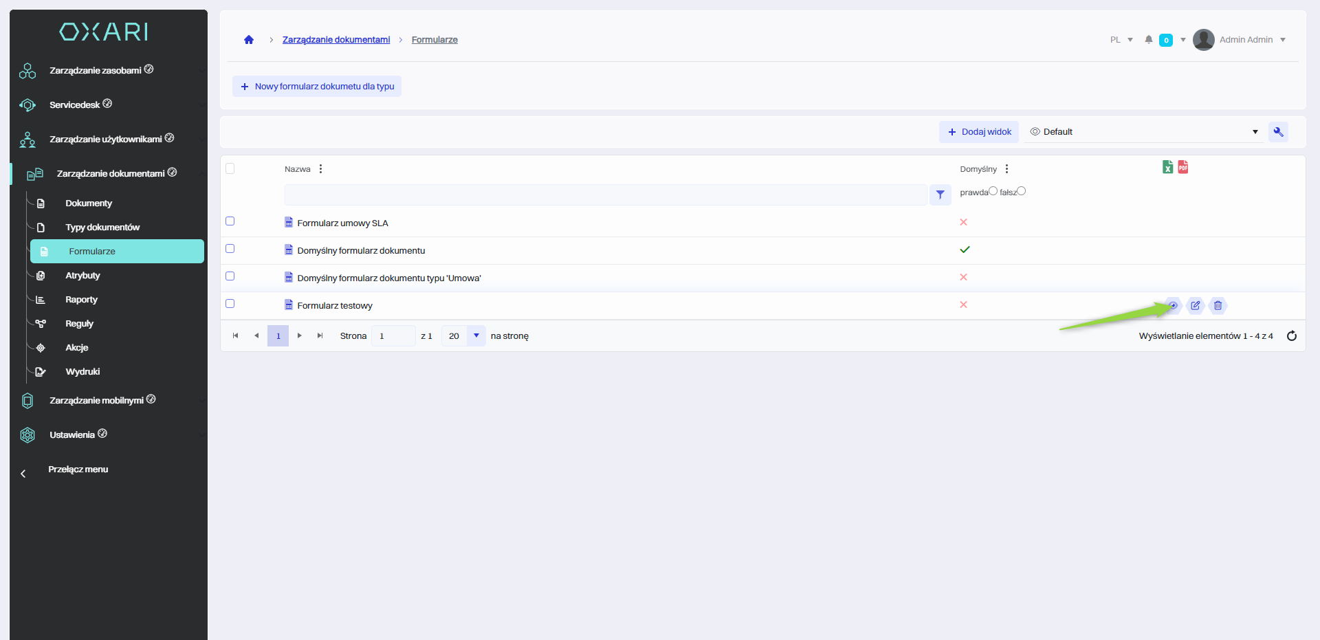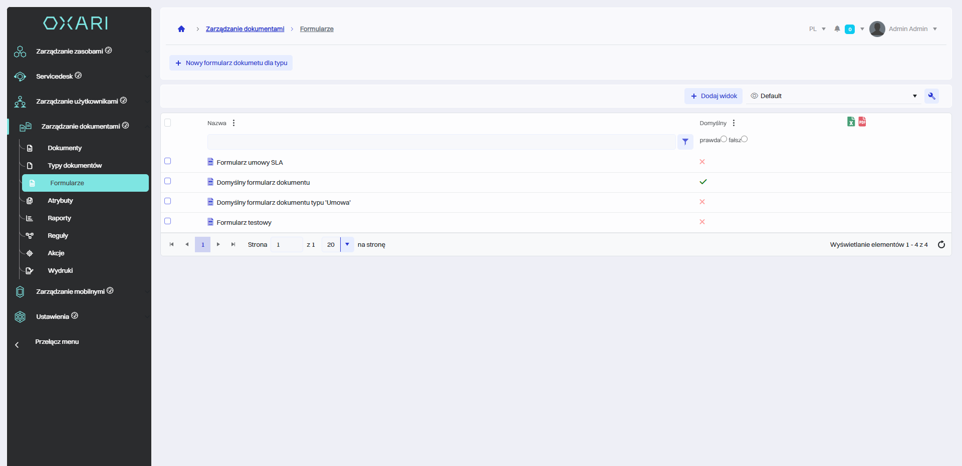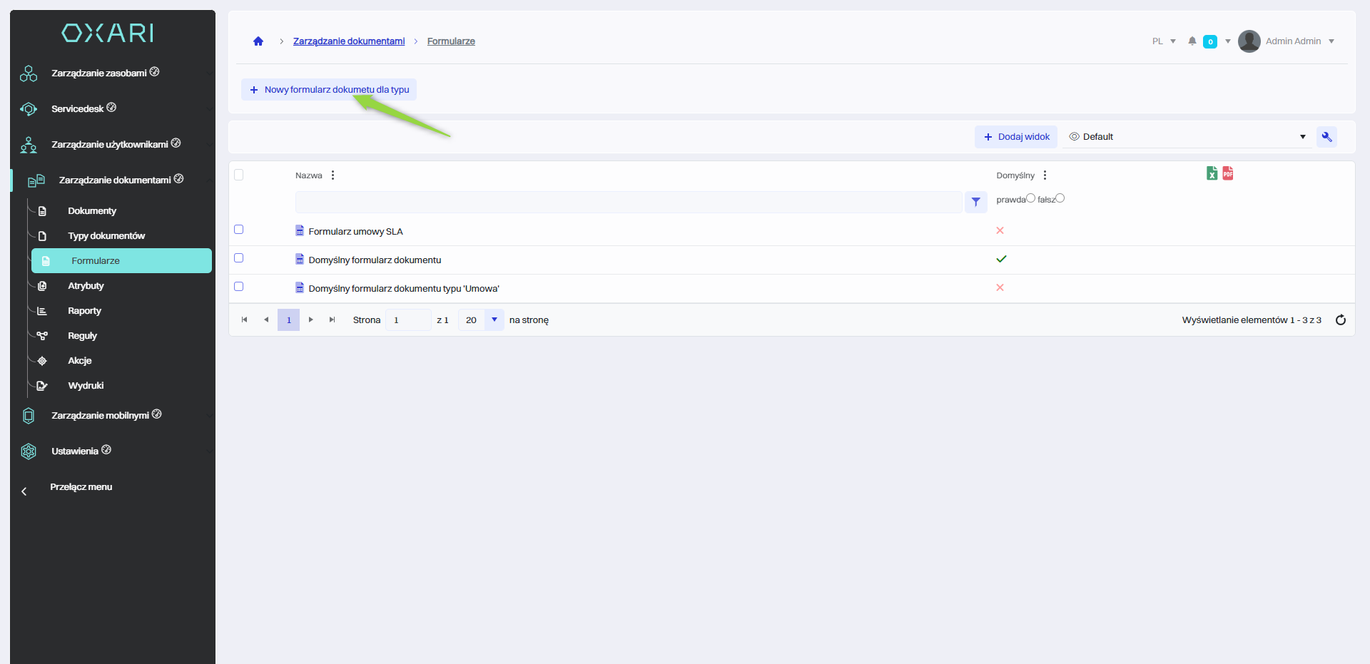 W celu stworzenia nowego formularza należy przejść do sekcji Zarządzanie dokumentami > Formularze, a następnie kliknąć przycisk “Nowy formularz dokumentu dla typu”.