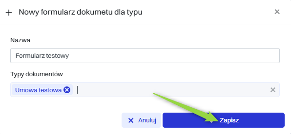 Następnie w oknie “Nowy formularz dokumentu dla typu” należy wypełnić pola, a następnie kliknąć przycisk “Zapisz”.