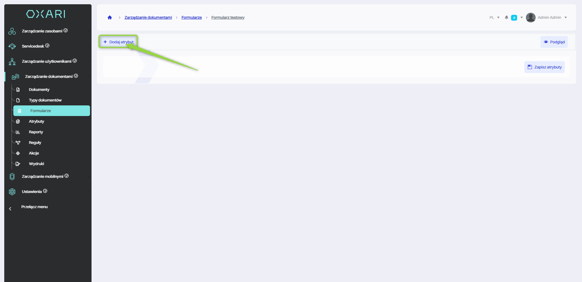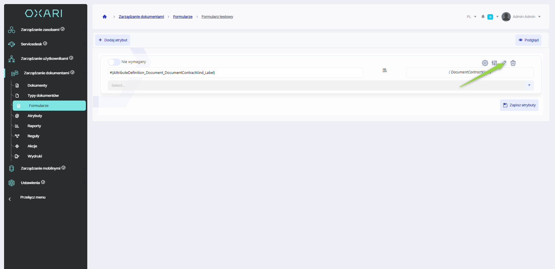 W ramach edycji formularza można dodawać nowe atrybuty. Aby dodać nowy atrybut, należy kliknąć przycisk “Dodaj atrybut”.
