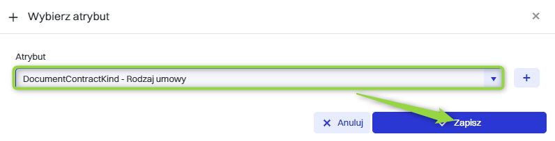 Atrybut zostanie zapisany, będzie widoczny w liście zapisanych atrybutów. Żeby użyć atrybutu, należy wybrać go z listy i kliknąć przycisk “Zapisz”.