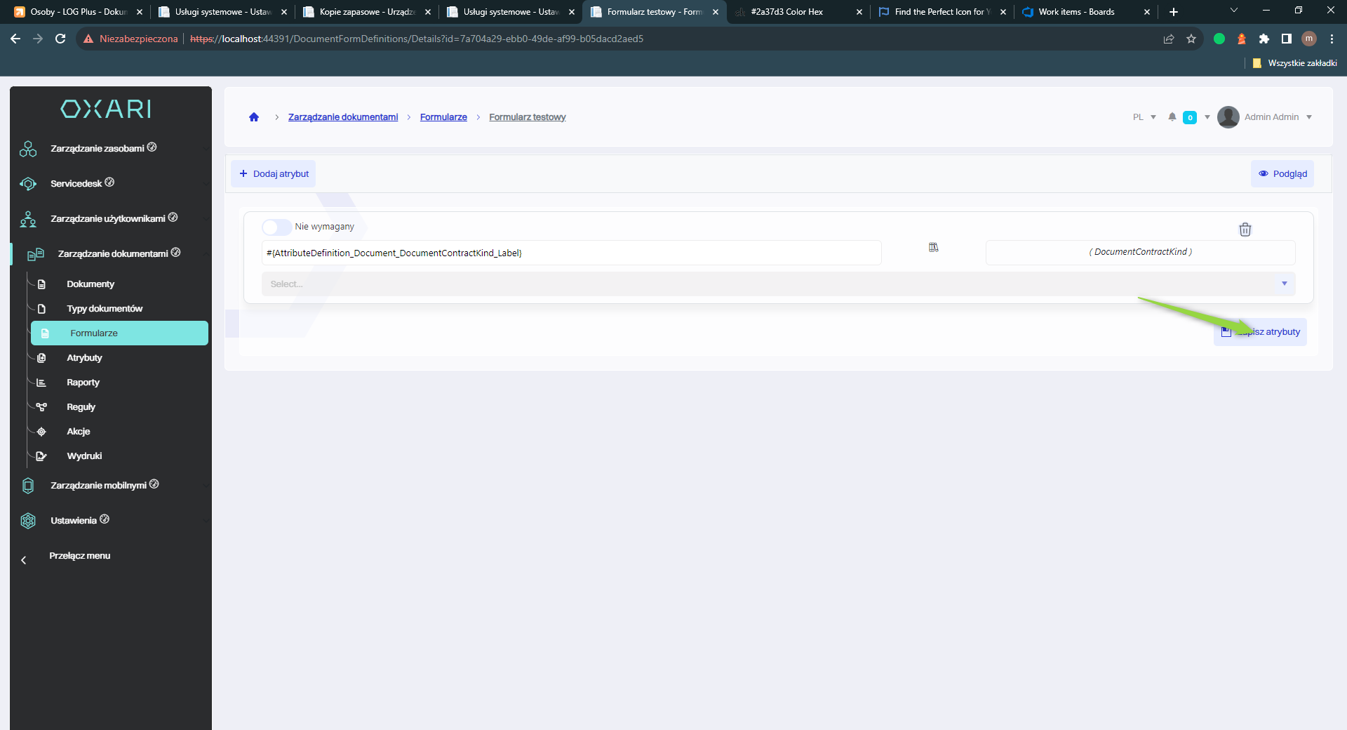 Aby zapisać atrybut do formularza na samym końcu trzeba kliknąć przycisk “Zapisz atrybuty”.