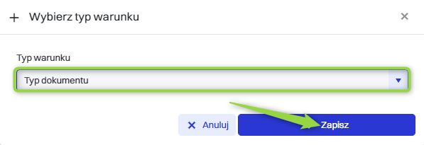 Następnie w oknie “Wybierz typ warunku” należy z listy wybrać typ warunku i kliknąć przycisk “Zapisz”.
