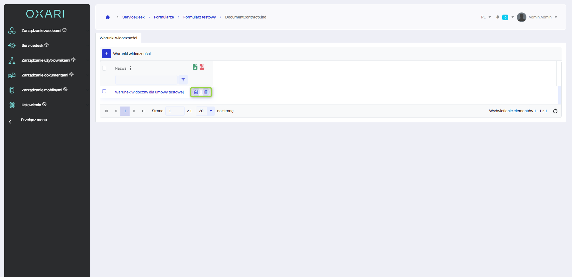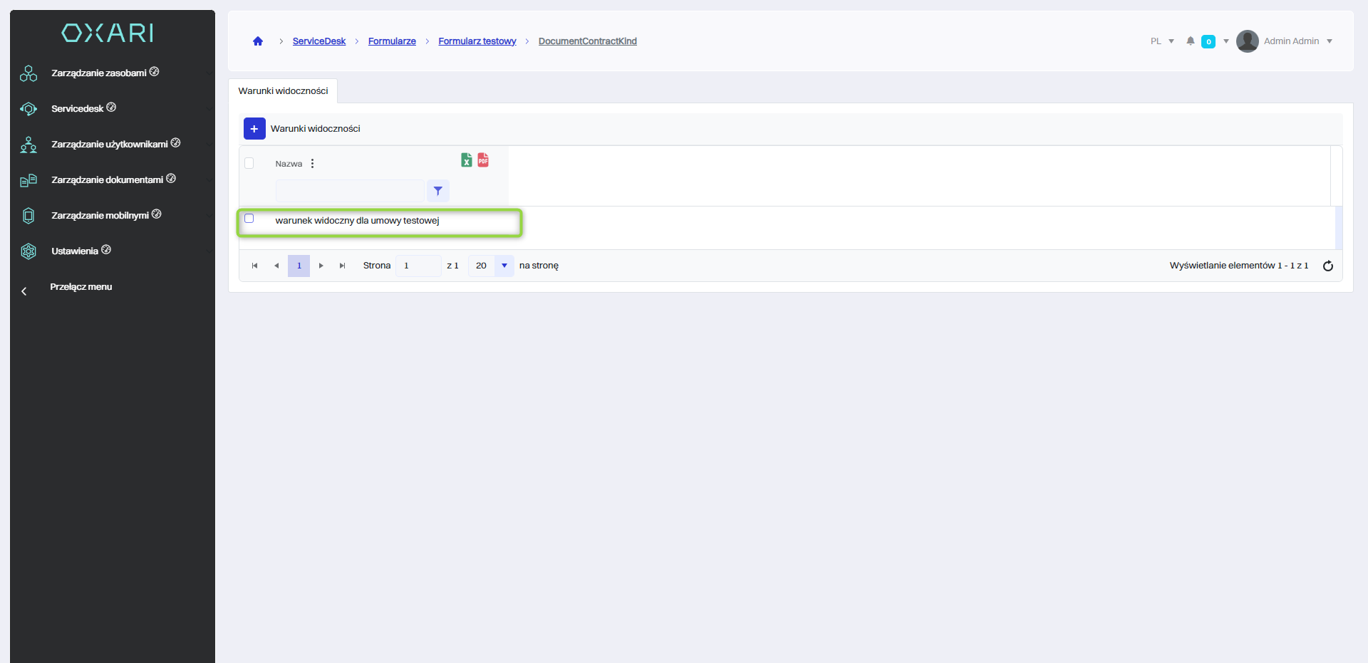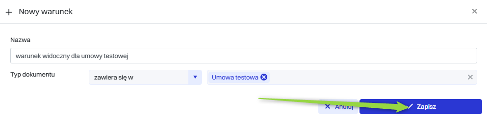 | 3 | Pole do wprowadzenia warunku (Typ dokumentu zawiera się w Umowa testowa) co oznacza, że warunek będzie widoczny gdy typem dokumentu będzie “Umowa testowa”. |