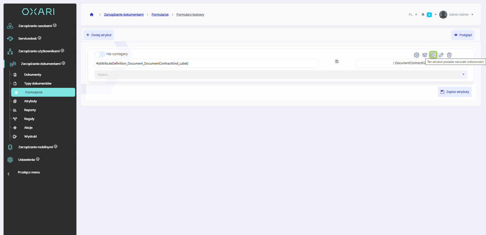 Warunki widoczności atrybutów pozwalają na kontrolowanie, kiedy poszczególne atrybuty formularza są wyświetlane użytkownikom. Mogą być one używane do tworzenia dynamicznych formularzy, gdzie pewne pola stają się widoczne tylko pod określonymi warunkami, na przykład tylko w danych umowach, zakładając, że formularz jest użyty w więcej niż jednym typie dokumentów. Należy przejść w szczegóły formularza.